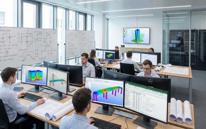- Determinación de cargas (muertas, vivas, sísmicas, viento), cálculo de esfuerzos (momentos flectores, cortantes) y deformaciones.
